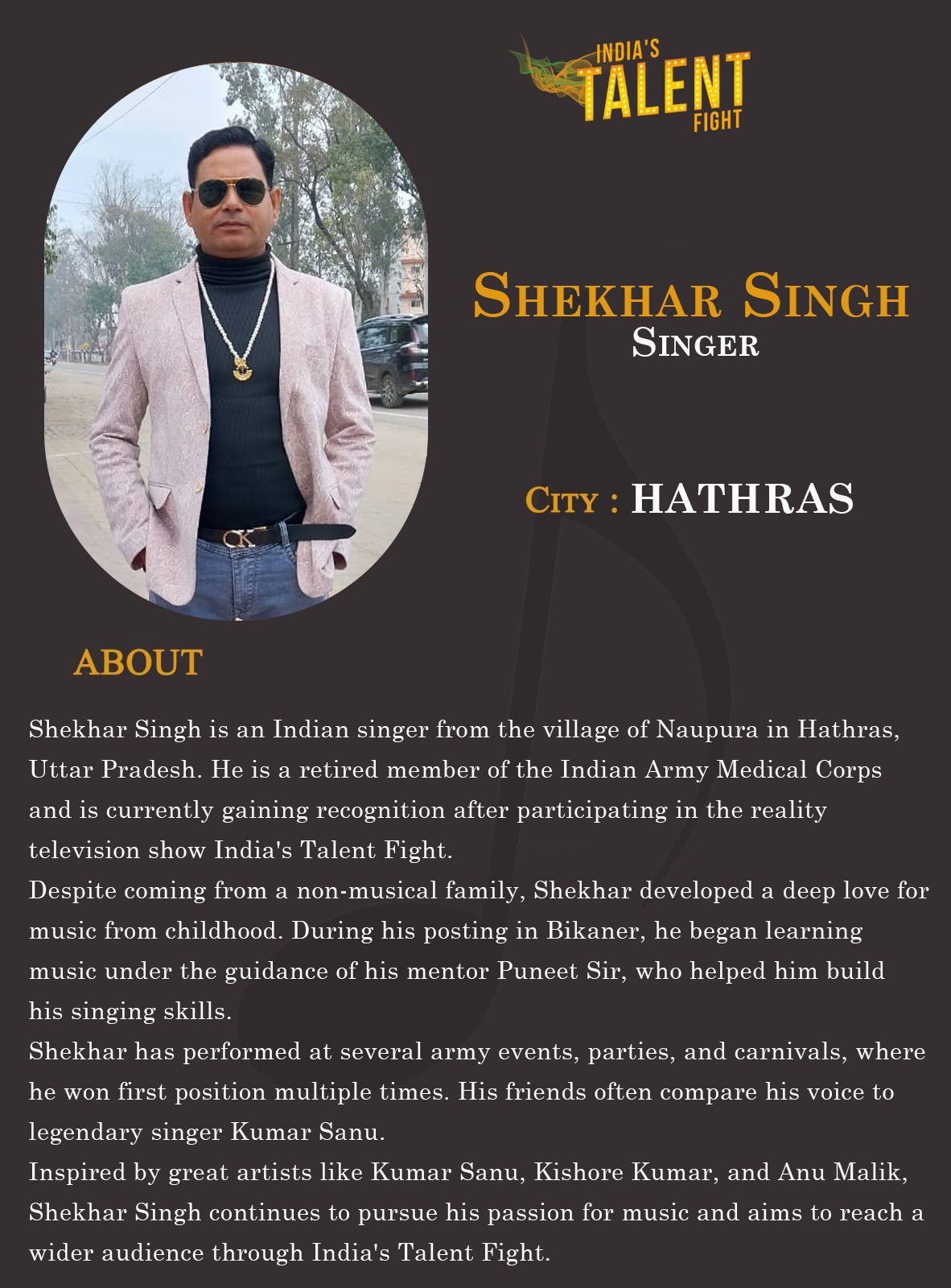 ITF Singer Shekhar Singh hathrasShekhar Singh is an Indian singer from the village of Naupura in Hathras, Uttar Pradesh. He is a retired member of the Indian Army Medical Corps and is currently gaining recognition after participating in the reality television show India’s Talent Fight.Despite coming from a non-musical family, Shekhar developed a deep love for music from childhood. During his posting in Bikaner, he began learning music under the guidance of his mentor Puneet