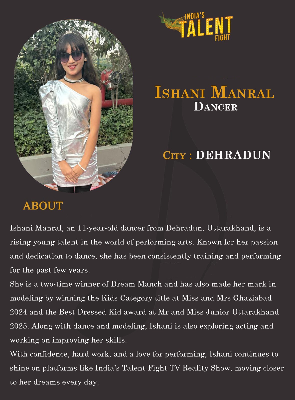 ITF Dancer Ishani Manral dehradunIshani Manral, an 11-year-old dancer from Dehradun, Uttarakhand, is a rising young talent in the world of performing arts. Known for her passion and dedication to dance, she has been consistently training and performing for the past few years.She is a two-time winner of Dream Manch and has also made her mark in modeling by winning the Kids Category title at Miss and Mrs Ghaziabad 2024 and the Best Dressed Kid