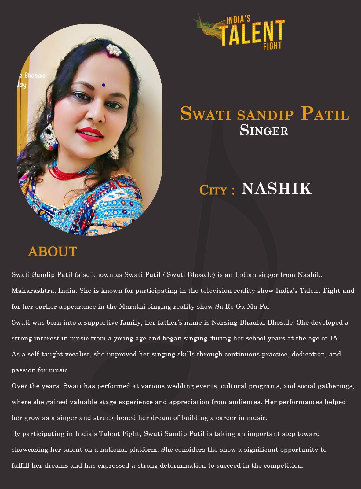 ITF Swati sandip Patil singer nashikSwati Sandip Patil (also known as Swati Patil / Swati Bhosale) is an Indian singer from Nashik, Maharashtra, India. She is known for participating in the television reality show India’s Talent Fight and for her earlier appearance in the Marathi singing reality show Sa Re Ga Ma Pa.Swati was born into a supportive family; her father’s name is Narsing Bhaulal Bhosale. She developed a strong interest in music from a