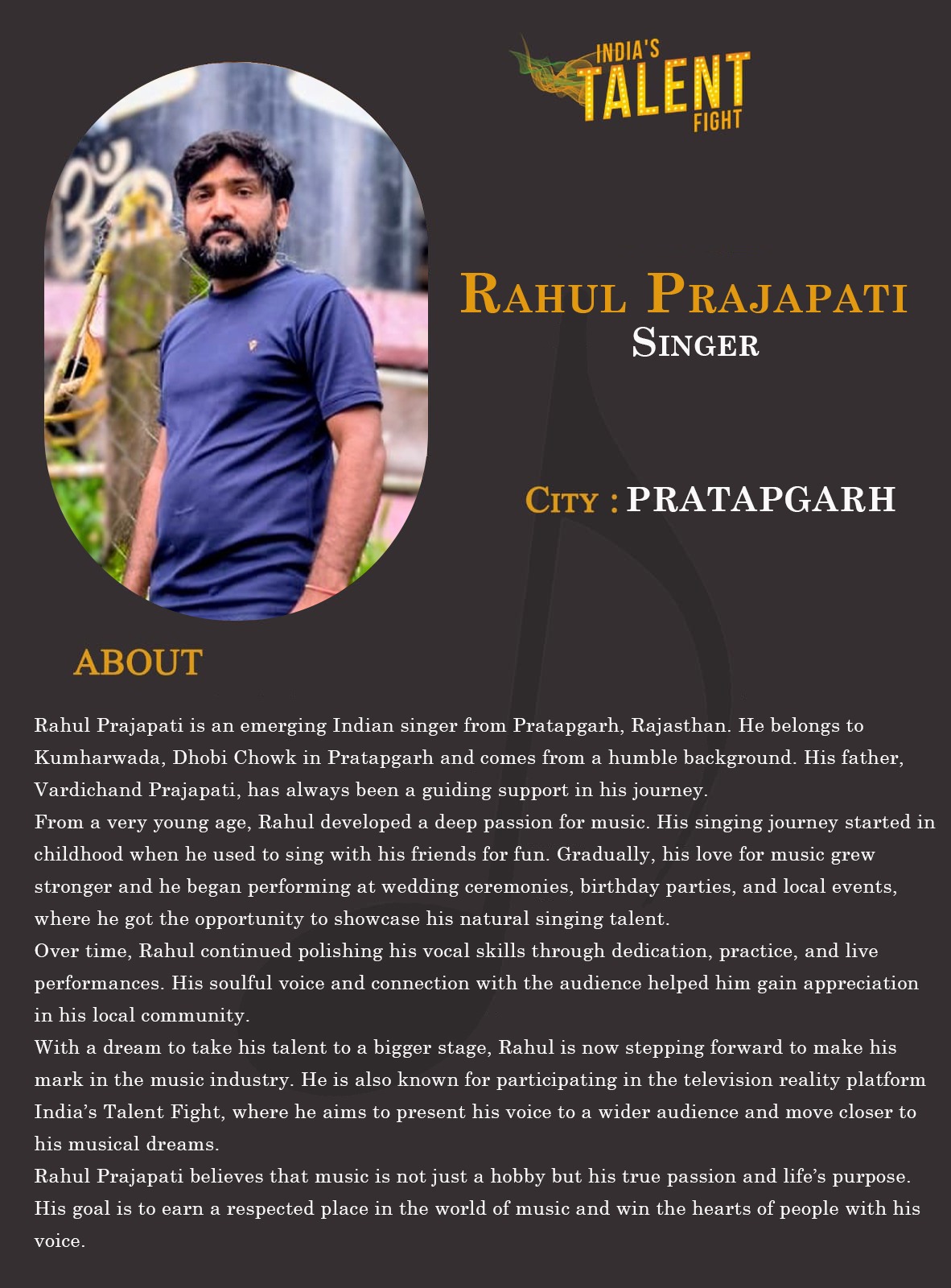 ITF Singer Rahul Prajapati pratapgarhRahul Prajapati is an emerging Indian singer from Pratapgarh, Rajasthan. He belongs to Kumharwada, Dhobi Chowk in Pratapgarh and comes from a humble background. His father, Vardichand Prajapati, has always been a guiding support in his journey.From a very young age, Rahul developed a deep passion for music. His singing journey started in childhood when he used to sing with his friends for fun. Gradually, his love for music grew stronger