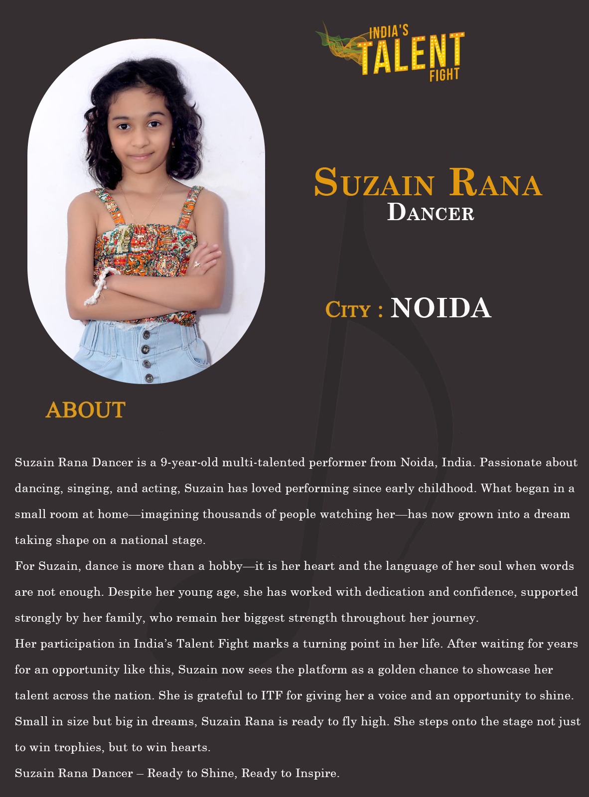 ITF Dancer Suzain Rana noidaSuzain Rana Dancer is a 9-year-old multi-talented performer from Noida, India. Passionate about dancing, singing, and acting, Suzain has loved performing since early childhood. What began in a small room at home—imagining thousands of people watching her—has now grown into a dream taking shape on a national stage.For Suzain, dance is more than a hobby—it is her heart and the language of her soul when words are not enough. Despite her