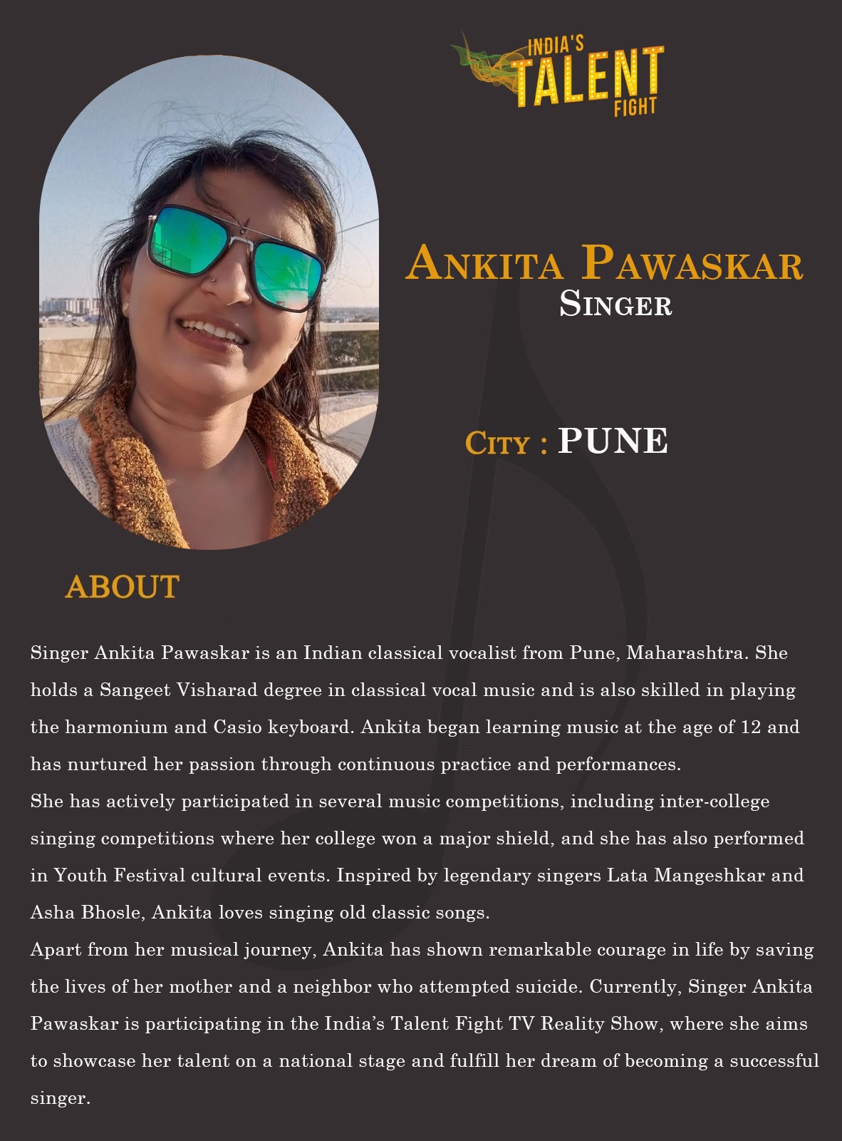 ITF Singer Ankita pawaskar puneSinger Ankita Pawaskar is an Indian classical vocalist from Pune, Maharashtra. She holds a Sangeet Visharad degree in classical vocal music and is also skilled in playing the harmonium and Casio keyboard. Ankita began learning music at the age of 12 and has nurtured her passion through continuous practice and performances.She has actively participated in several music competitions, including inter-college singing competitions where her college won a major shield, and she