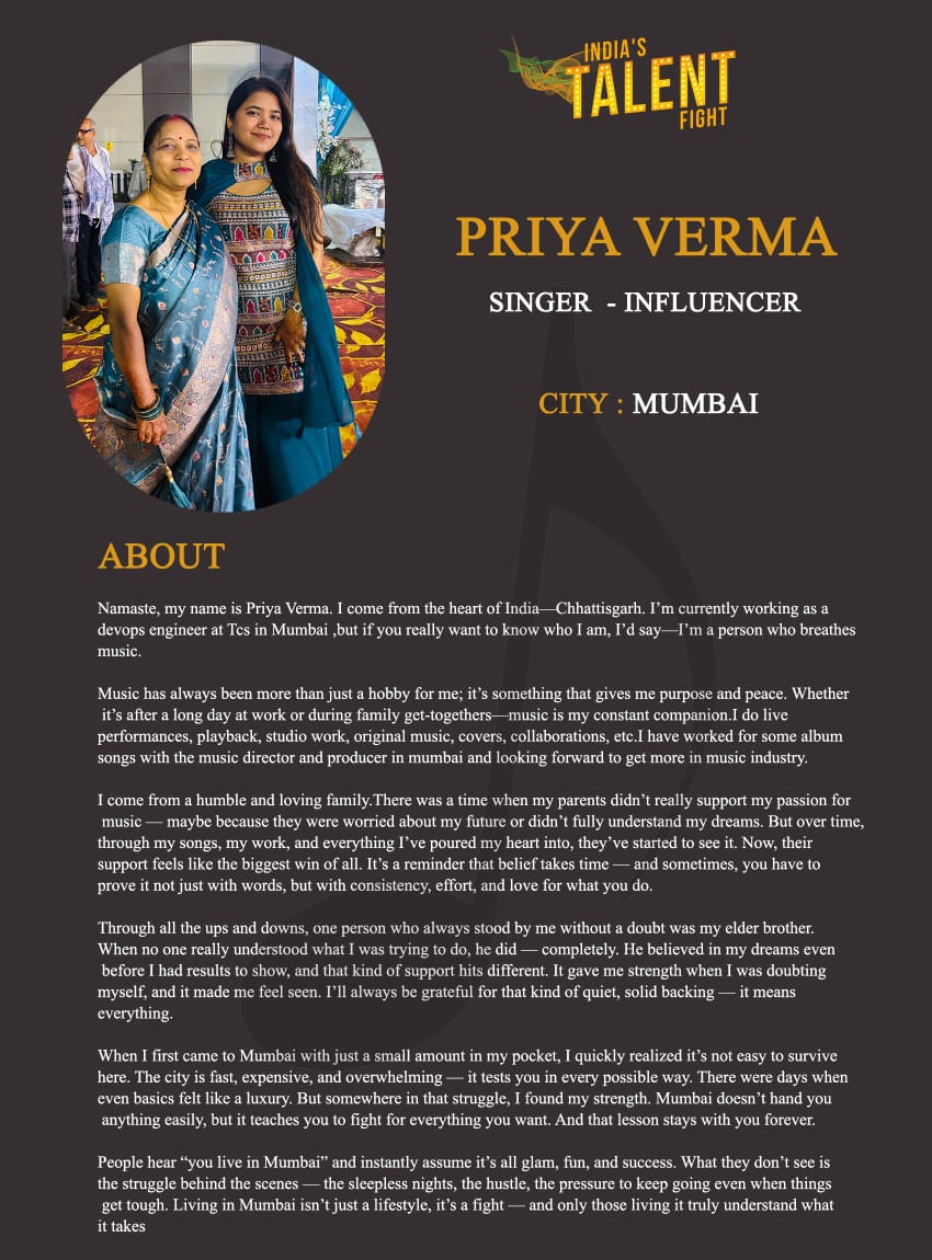 ITF Singer Priya Verma MumbaiNamaste, my name is Priya Verma. I come from the heart of India—Chhattisgarh. I’m currently working as a devops engineer at Tcs in Mumbai ,but if you really want to know who I am, I’d say—I’m a person who breathes music.Music has always been more than just a hobby for me; it’s something that gives me purpose and peace. Whether it’s after a long day at work or during family get-togethers—music