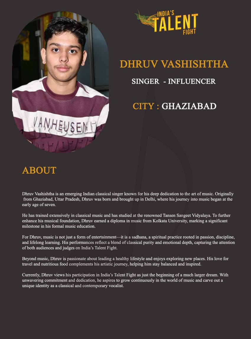 ITF Singer Dhruv Vashishtha GhaziabadDhruv Vashishtha is an emerging Indian classical singer known for his deep dedication to the art of music. Originally from Ghaziabad, Uttar Pradesh, Dhruv was born and brought up in Delhi, where his journey into music began at the early age of seven.He has trained extensively in classical music and has studied at the renowned Tansen Sangeet Vidyalaya. To further enhance his musical foundation, Dhruv earned a diploma in music from