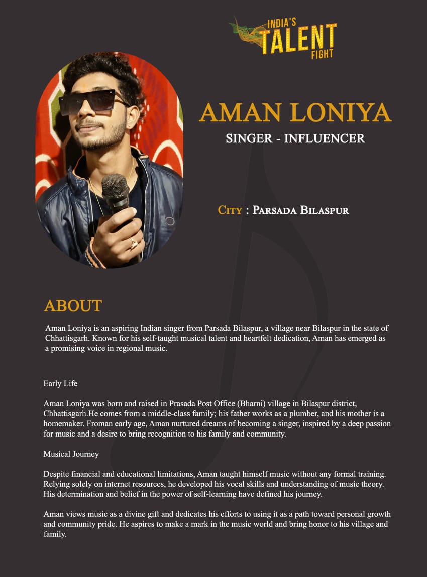 ITF Singer Aman Loniya Parsada BilaspurAman Loniya is an aspiring Indian singer from Bharni, a village near Bilaspur in the state of Chhattisgarh. Known for his self-taught musical talent and heartfelt dedication, Aman has emerged as a promising voice in regional music.Early LifeAman Loniya was born and raised in Prasada Post Office (Bharni) village in Bilaspur district, Chhattisgarh. He comes from a middle-class family; his father works as a plumber, and his mother is a