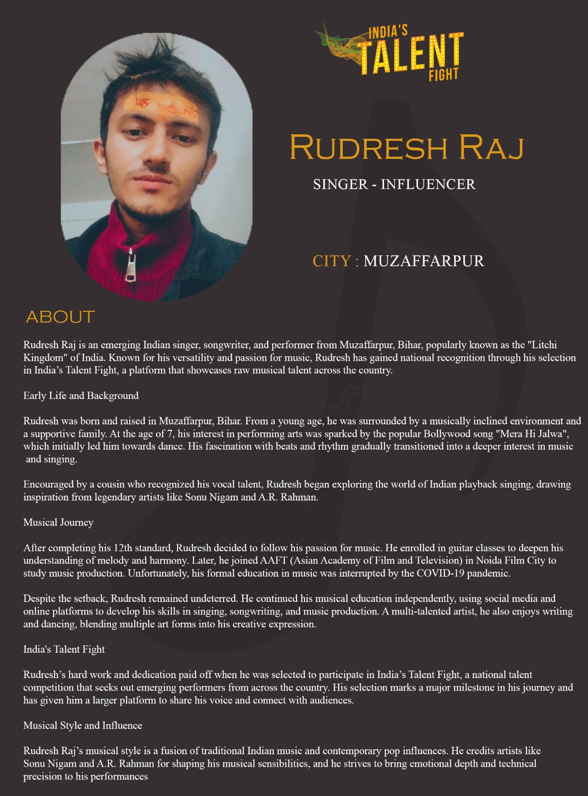 ITF Singer Rudresh Raj MuzaffarpurRudresh Raj is an emerging Indian singer, songwriter, and performer from Muzaffarpur, Bihar, popularly known as the “Litchi Kingdom” of India. Known for his versatility and passion for music, Rudresh has gained national recognition through his selection in India’s Talent Fight, a platform that showcases raw musical talent across the country.Early Life and BackgroundRudresh was born and raised in Muzaffarpur, Bihar. From a young age, he was surrounded by a musically