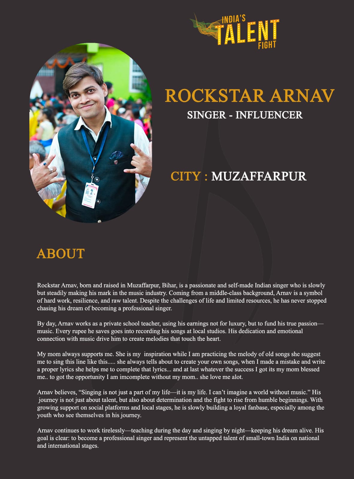 ITF Singer Rockstar Arnav MuzaffarpurRockstar Arnav, born and raised in Muzaffarpur, Bihar, is a passionate and self-made Indian singer who is slowly but steadily making his mark in the music industry. Coming from a middle-class background, Arnav is a symbol of hard work, resilience, and raw talent. Despite the challenges of life and limited resources, he has never stopped chasing his dream of becoming a professional singer.By day, Arnav works as a private school teacher,