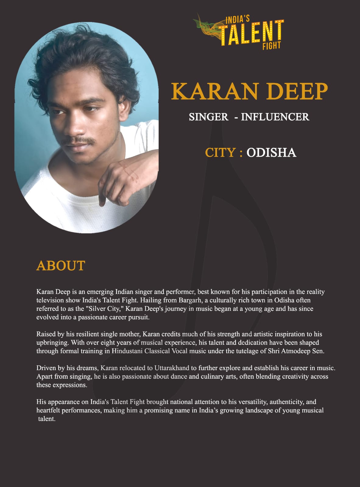 ITF Singer Karandeep Bargarh OdishaKarandeep is an emerging Indian singer and performer, best known for his participation in the reality television show India’s Talent Fight. Hailing from Bargarh, a culturally rich town in Odisha often referred to as the “Silver City,” Karan Deep’s journey in music began at a young age and has since evolved into a passionate career pursuit.Raised by his resilient single mother, Karan credits much of his strength and artistic inspiration to