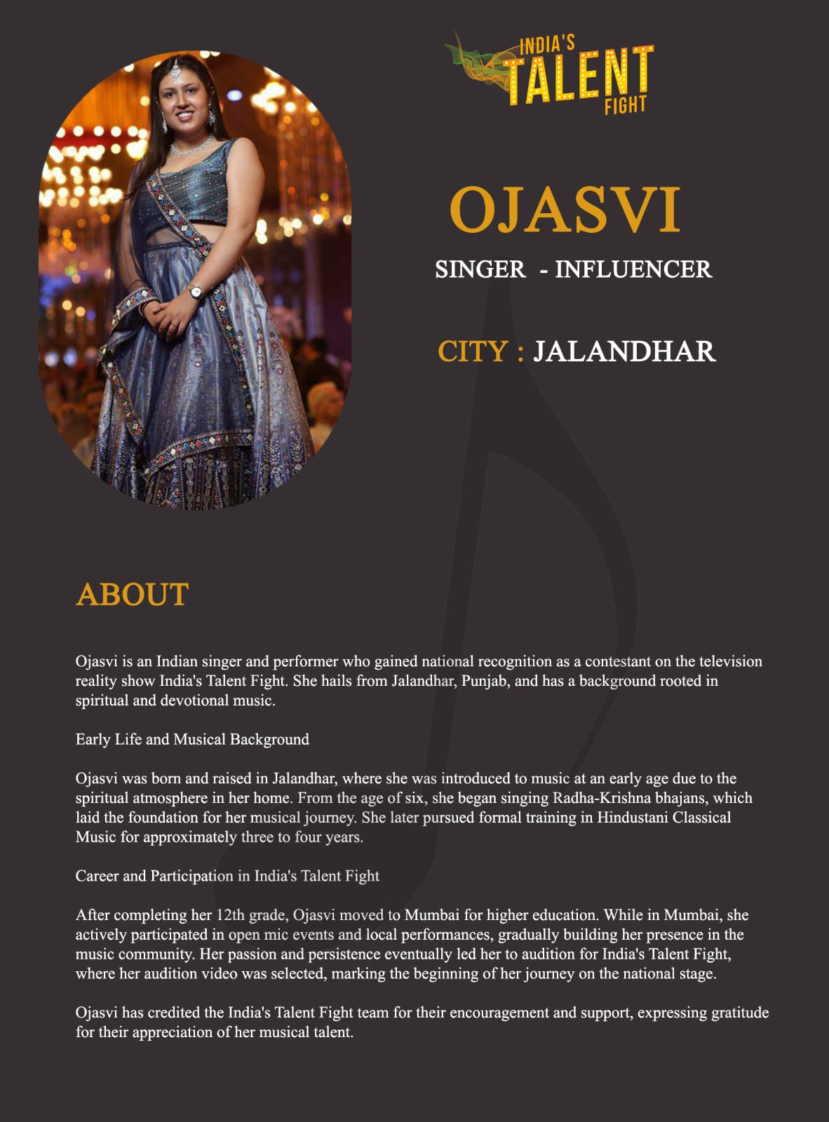 ITF Singer Ojasvi JalandharOjasvi is an Indian singer and performer who gained national recognition as a contestant on the television reality show India’s Talent Fight. She hails from Jalandhar, Punjab, and has a background rooted in spiritual and devotional music.Early Life and Musical BackgroundOjasvi was born and raised in Jalandhar, where she was introduced to music at an early age due to the spiritual atmosphere in her home. From the age of six, she began