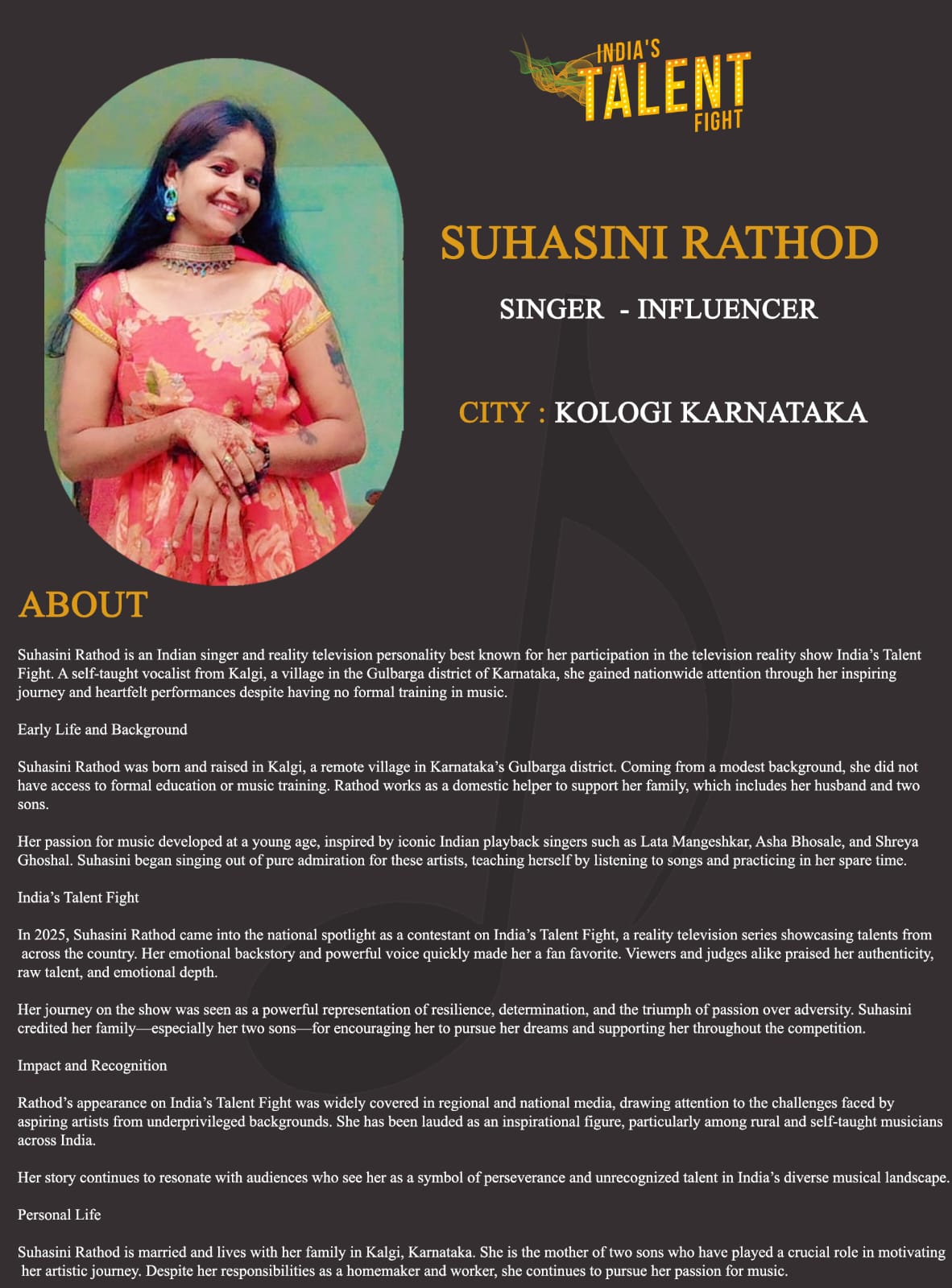ITF Singer Suhasini Rathod Kologi KarnatakaSuhasini Rathod is an Indian singer and reality television personality best known for her participation in the television reality show India’s Talent Fight. A self-taught vocalist from Kalgi, a village in the Gulbarga district of Karnataka, she gained nationwide attention through her inspiring journey and heartfelt performances despite having no formal training in music.Early Life and BackgroundSuhasini Rathod was born and raised in Kalgi, a remote village in Karnataka’s Gulbarga