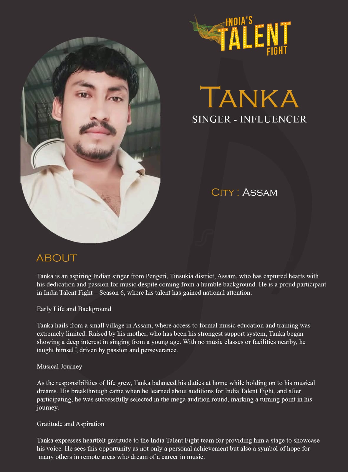 ITF Singer Tanka (Asaam)Tanka is an aspiring Indian singer from Pengeri, Tinsukia district, Assam, who has captured hearts with his dedication and passion for music despite coming from a humble background. He is a proud participant in India Talent Fight – Season 6, where his talent has gained national attention.Early Life and BackgroundTanka hails from a small village in Assam, where access to formal music education and training was extremely limited. Raised by his mother,