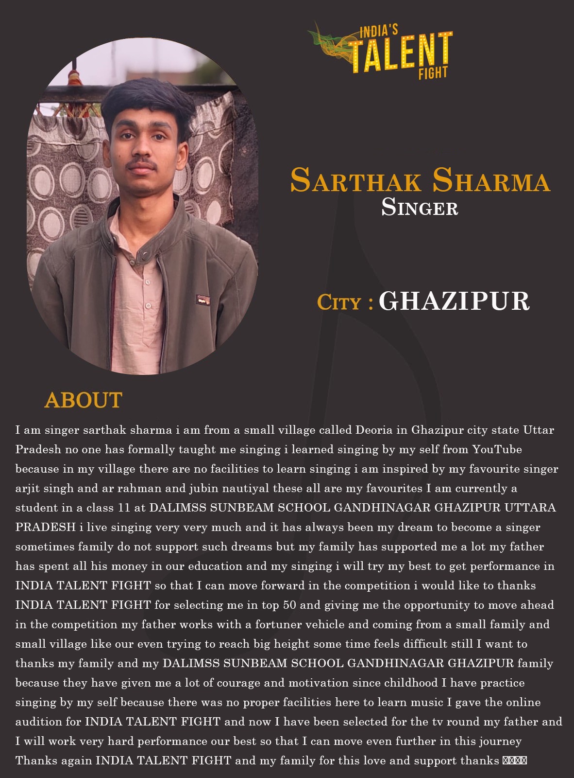 ITF Singer Surjit kumar rupnagarI am singer sarthak sharma i am from a small village called Deoria in Ghazipur city state Uttar Pradesh no one has formally taught me singing i learned singing by my self from YouTube because in my village there are no facilities to learn singing i am inspired by my favourite singer arjit singh and ar rahman and jubin nautiyal these all are my favourites I am currently a student in