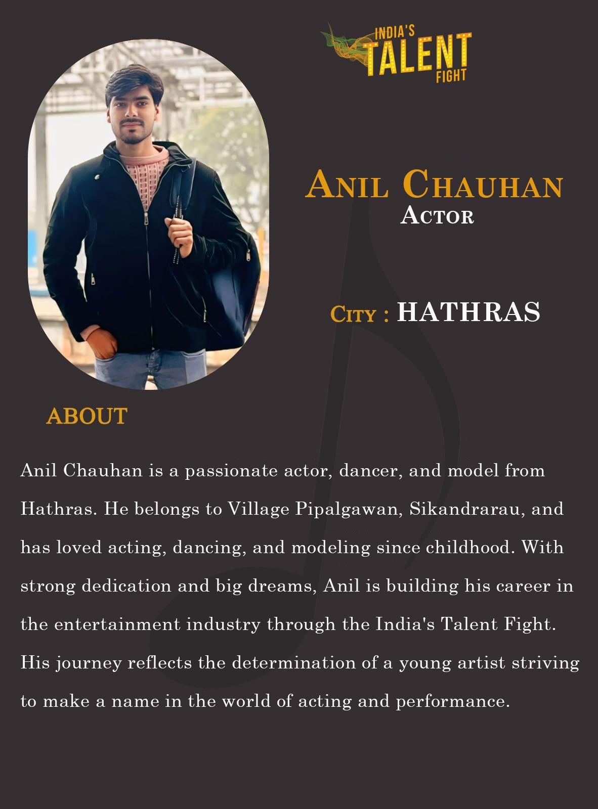 ITF Actor Anil Chauhan hathrasAnil Chauhan is a passionate actor, dancer, and model from Hathras. He belongs to Village Pipalgawan, Sikandrarau, and has loved acting, dancing, and modeling since childhood. With strong dedication and big dreams, Anil is building his career in the entertainment industry through the India’s Talent Fight. His journey reflects the determination of a young artist striving to make a name in the world of acting and performance. ITF Actor, ITF Season