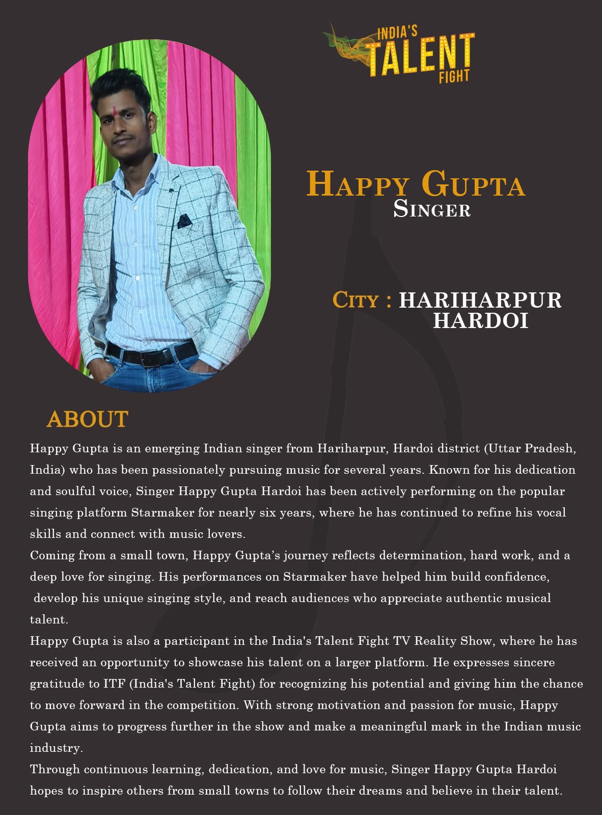 ITF Singer Happy gupta Hariharpur hardoiHappy Gupta is an emerging Indian singer from Hariharpur, Hardoi district (Uttar Pradesh, India) who has been passionately pursuing music for several years. Known for his dedication and soulful voice, Singer Happy Gupta Hardoi has been actively performing on the popular singing platform Starmaker for nearly six years, where he has continued to refine his vocal skills and connect with music lovers.Coming from a small town, Happy Gupta’s journey reflects
