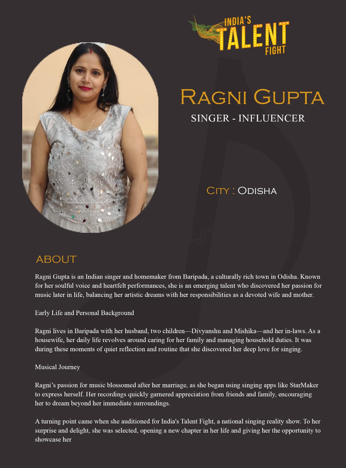 ITF Singer Ragni Gupta OdishaRagni Gupta is an Indian singer and homemaker from Baripada, a culturally rich town in Odisha. Known for her soulful voice and heartfelt performances, she is an emerging talent who discovered her passion for music later in life, balancing her artistic dreams with her responsibilities as a devoted wife and mother.Early Life and Personal BackgroundRagni lives in Baripada with her husband, two children—Divyanshu and Mishika—and her in-laws. As a housewife, her