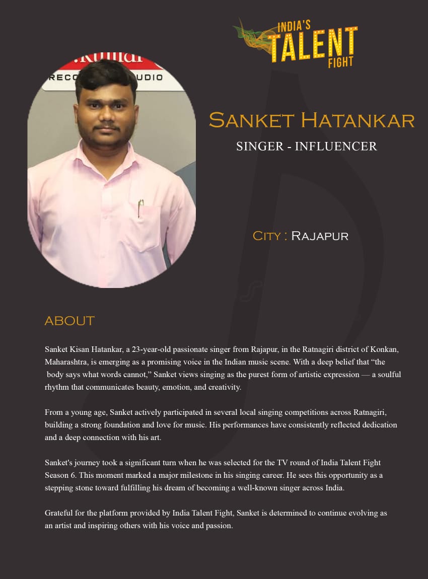 ITF Singer Sanket Hatankar RajapurSanket Kisan Hatankar, a 23-year-old passionate singer from Rajapur, in the Ratnagiri district of Konkan, Maharashtra, is emerging as a promising voice in the Indian music scene. With a deep belief that “the body says what words cannot,” Sanket views singing as the purest form of artistic expression — a soulful rhythm that communicates beauty, emotion, and creativity.From a young age, Sanket actively participated in several local singing competitions across Ratnagiri,