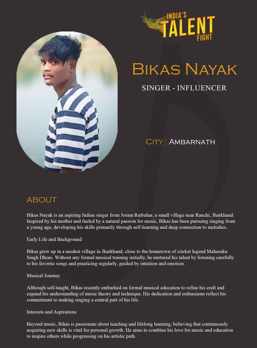 ITF Singer Bikas Nayak (Ambarnath)Bikas Nayak is an aspiring Indian singer from Joram Raibahar, a small village near Ranchi, Jharkhand. Inspired by his mother and fueled by a natural passion for music, Bikas has been pursuing singing from a young age, developing his skills primarily through self-learning and deep connection to melodies.Early Life and BackgroundBikas grew up in a modest village in Jharkhand, close to the hometown of cricket legend Mahendra Singh Dhoni. Without any