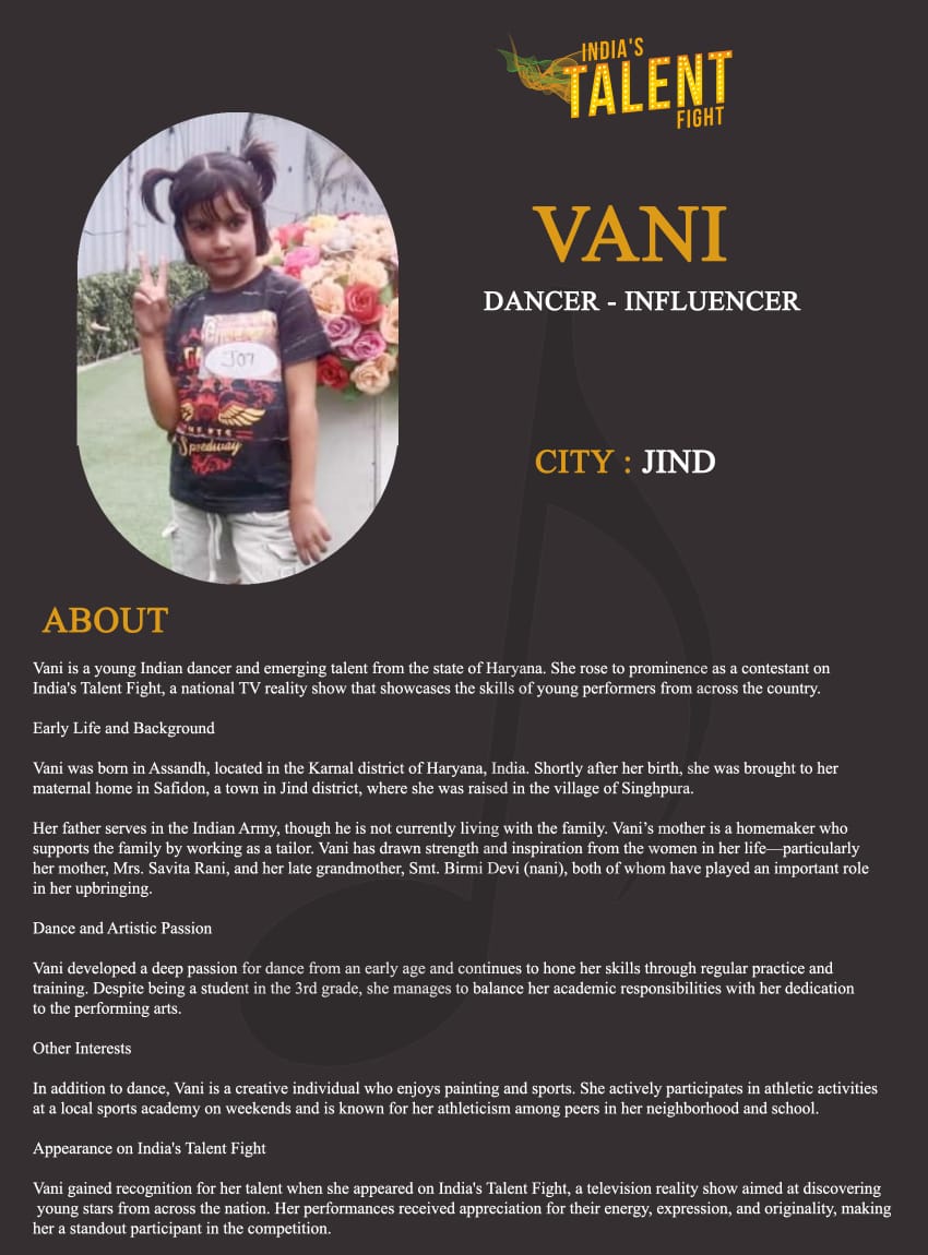 ITF Dancer Vani JindVani is a young Indian dancer and emerging talent from the state of Haryana. She rose to prominence as a contestant on India’s Talent Fight, a national TV reality show that showcases the skills of young performers from across the country.Early Life and BackgroundVani was born in Assandh, located in the Karnal district of Haryana, India. Shortly after her birth, she was brought to her maternal home in Safidon (सर्प दमन), a