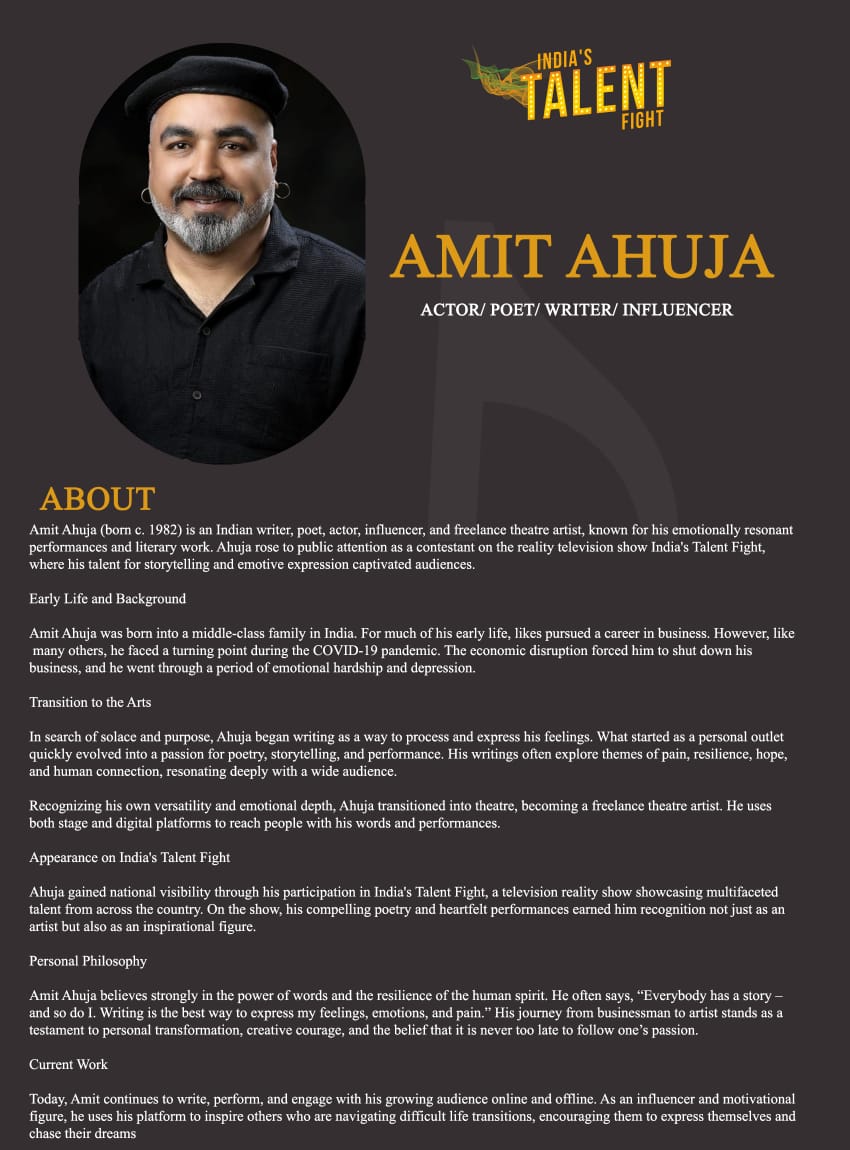 ITF Actor Amit Ahuja MeerutActor/ Poet/ Writer/ InfluencerAmit Ahuja (born c. 1982) is an Indian writer, poet, actor, influencer, and freelance theatre artist, known for his emotionally resonant performances and literary work. Ahuja rose to public attention as a contestant on the reality television show India’s Talent Fight, where his talent for storytelling and emotive expression captivated audiences.Early Life and BackgroundAmit Ahuja was born into a middle-class family in India. For much of his early