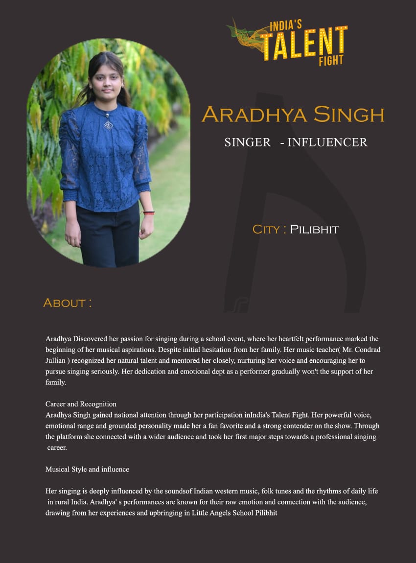 ITF Singer Aradhya Singh PilibhitAradhya Discovered her passion for singing during a school event, where her heartfelt performance marked the beginning of her musical aspirations. Despite initial hesitation from her family. Her music teacher( Mr. Condrad Jullian ) recognized her natural talent and mentored her closely, nurturing her voice and encouraging her to pursue singing seriously. Her dedication and emotional dept as a performer gradually won’t the support of her family.Career and RecognitionAradhya Singh gained