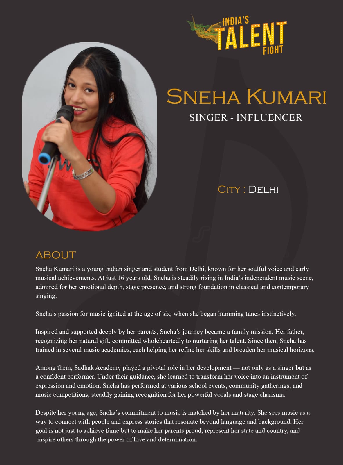 ITF Singer Sneha Kumari DelhiSneha Kumari is a young Indian singer and student from Delhi, known for her soulful voice and early musical achievements. At just 16 years old, Sneha is steadily rising in India’s independent music scene, admired for her emotional depth, stage presence, and strong foundation in classical and contemporary singing.Sneha’s passion for music ignited at the age of six, when she began humming tunes instinctively.Inspired and supported deeply by her parents, Sneha’s