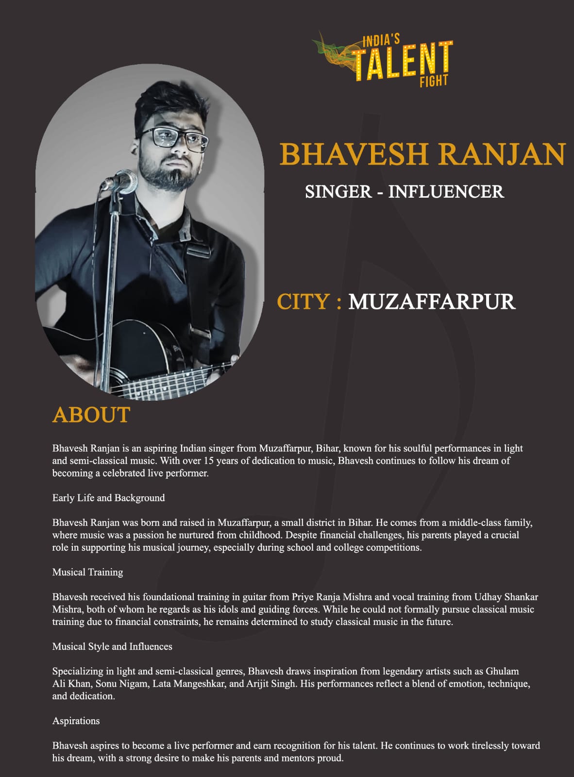 ITF Singer Bhavesh Ranjan MuzaffarpurBhavesh Ranjan is an aspiring Indian singer from Muzaffarpur, Bihar, known for his soulful performances in light and semi-classical music. With over 15 years of dedication to music, Bhavesh continues to follow his dream of becoming a celebrated live performer.Early Life and BackgroundBhavesh Ranjan was born and raised in Muzaffarpur, a small district in Bihar. He comes from a middle-class family, where music was a passion he nurtured from childhood. Despite