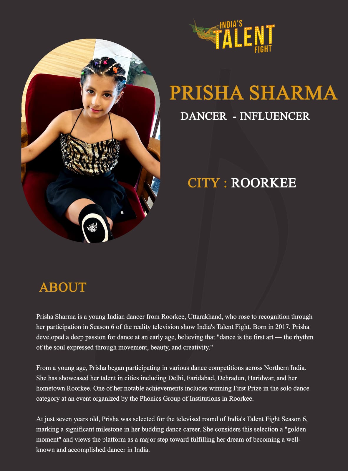 ITF Dancer Prisha Sharma RoorkeePrisha Sharma is a young Indian dancer from Roorkee, Uttarakhand, who rose to recognition through her participation in Season 6 of the reality television show India’s Talent Fight. Born in 2017, Prisha developed a deep passion for dance at an early age, believing that “dance is the first art — the rhythm of the soul expressed through movement, beauty, and creativity.”From a young age, Prisha began participating in various dance competitions