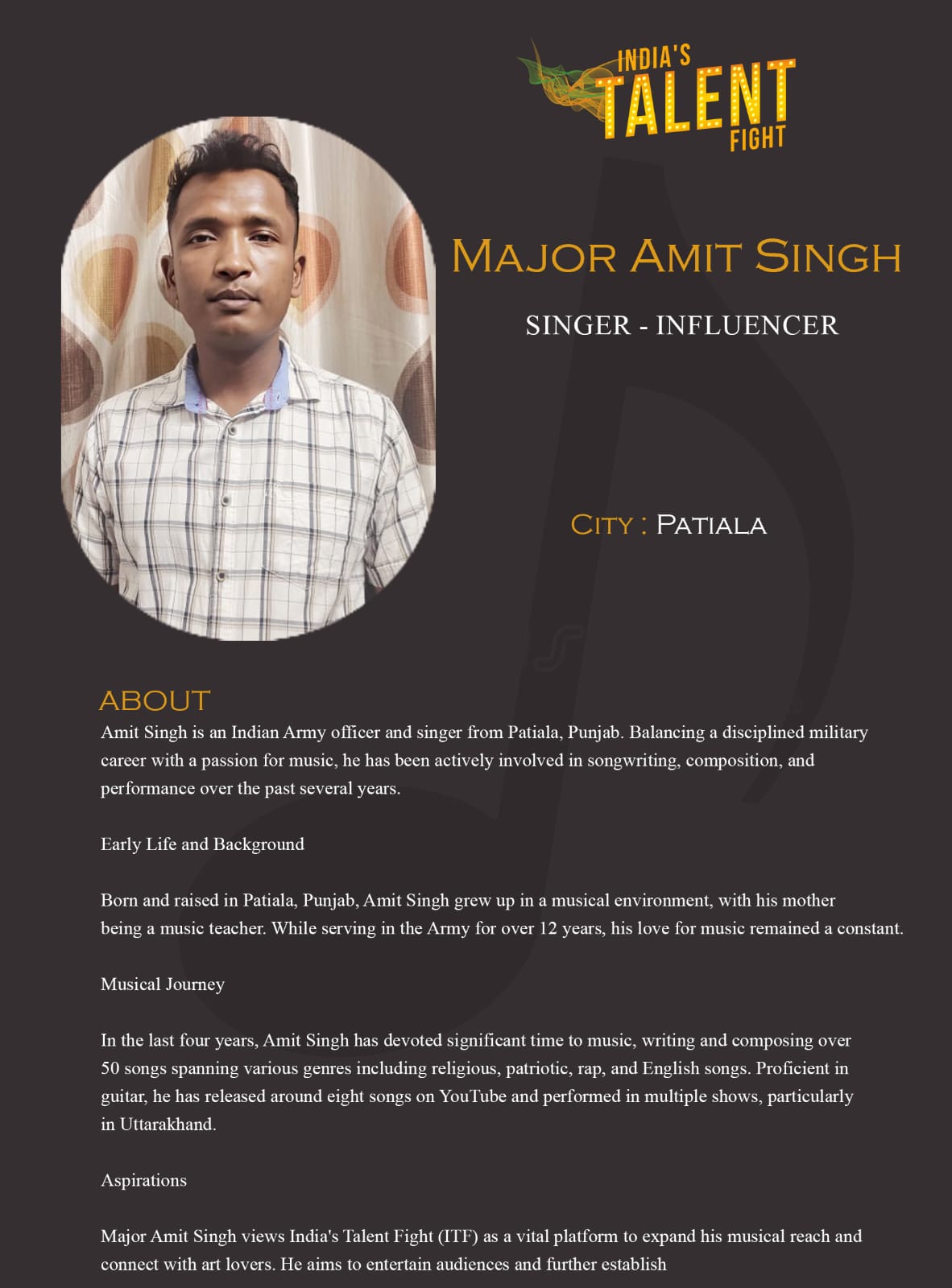 ITF Singer Major Amit Singh (Patiala)Amit Singh is an Indian Army officer and singer from Patiala, Punjab. Balancing a disciplined military career with a passion for music, he has been actively involved in songwriting, composition, and performance over the past several years.Early Life and BackgroundBorn and raised in Patiala, Punjab, Amit Singh grew up in a musical environment, with his mother being a music teacher. While serving in the Army for over 12 years, his