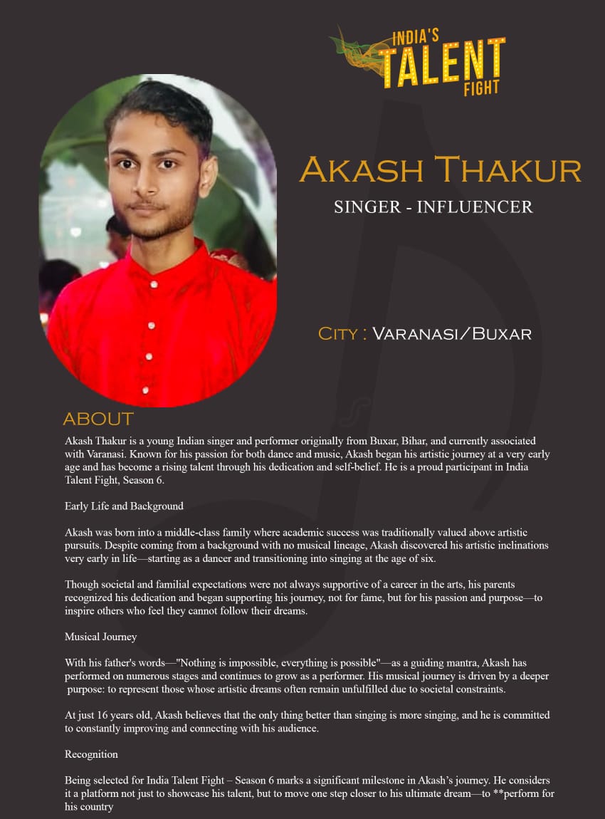 ITF Singer Akash Thakur Varanasi/BuxarAkash Thakur is a young Indian singer and performer originally from Buxar, Bihar, and currently associated with Varanasi. Known for his passion for both dance and music, Akash began his artistic journey at a very early age and has become a rising talent through his dedication and self-belief. He is a proud participant in India Talent Fight, Season 6.Early Life and BackgroundAkash was born into a middle-class family where academic success