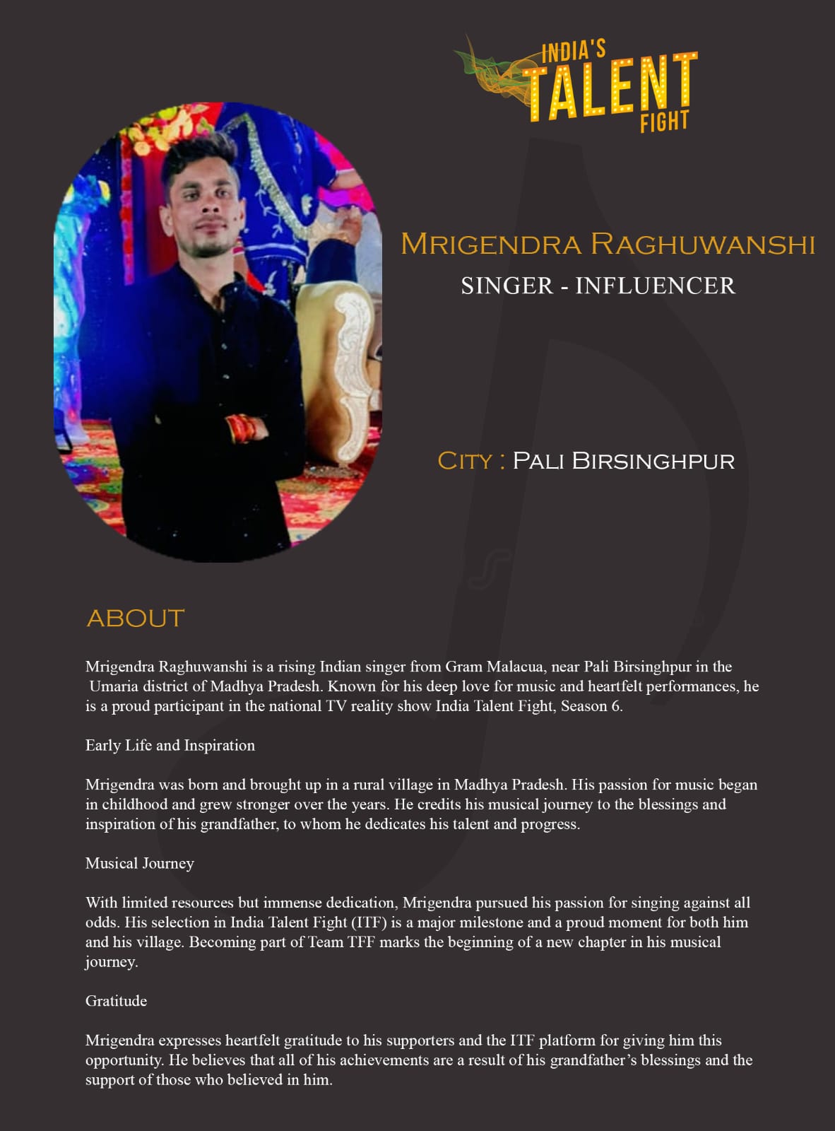 ITF Singer Mrigendra Raghuwanshi Pali BirsinghpurMrigendra Raghuwanshi is a rising Indian singer from Gram Malacua, near Pali Birsinghpur in the Umaria district of Madhya Pradesh. Known for his deep love for music and heartfelt performances, he is a proud participant in the national TV reality show India Talent Fight, Season 6.Early Life and InspirationMrigendra was born and brought up in a rural village in Madhya Pradesh. His passion for music began in childhood and grew