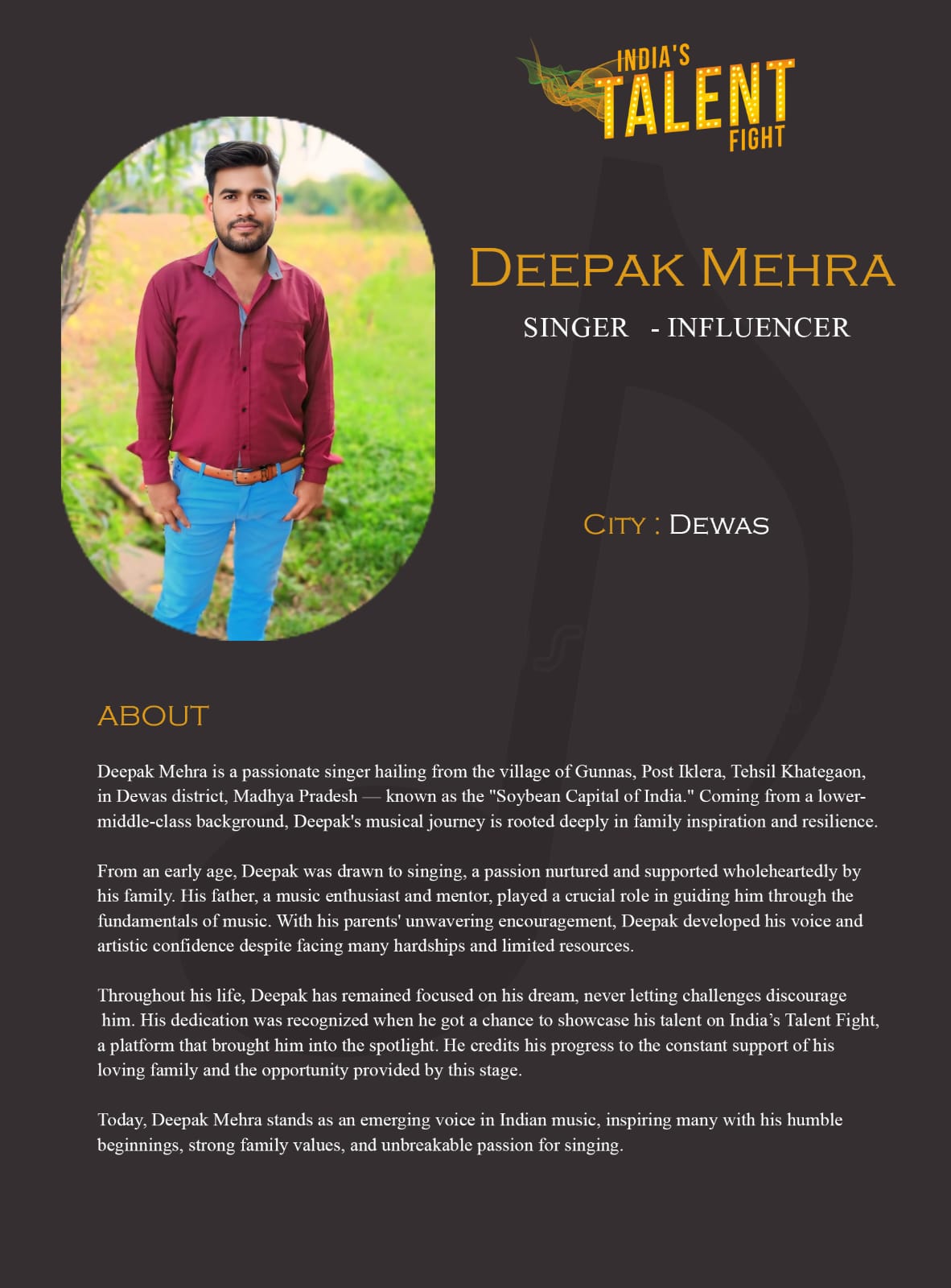 ITF Singer Deepak Mehra DewasDeepak Mehra is a passionate singer hailing from the village of Gunnas, Post Iklera, Tehsil Khategaon, in Dewas district, Madhya Pradesh — known as the “Soybean Capital of India.” Coming from a lower-middle-class background, Deepak’s musical journey is rooted deeply in family inspiration and resilience.From an early age, Deepak was drawn to singing, a passion nurtured and supported wholeheartedly by his family. His father, a music enthusiast and mentor, played a