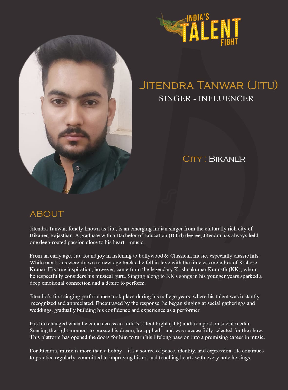 ITF Singer Jitendra Tanwar (Jitu) BikanerJitendra Tanwar, fondly known as Jitu, is an emerging Indian singer from the culturally rich city of Bikaner, Rajasthan. A graduate with a Bachelor of Education (B.Ed) degree, Jitendra has always held one deep-rooted passion close to his heart—music.From an early age, Jitu found joy in listening to Bollywood & Classical Music, Especially clasiss hits. While most kids were drawn to new-age tracks, he fell in love with the timeless
