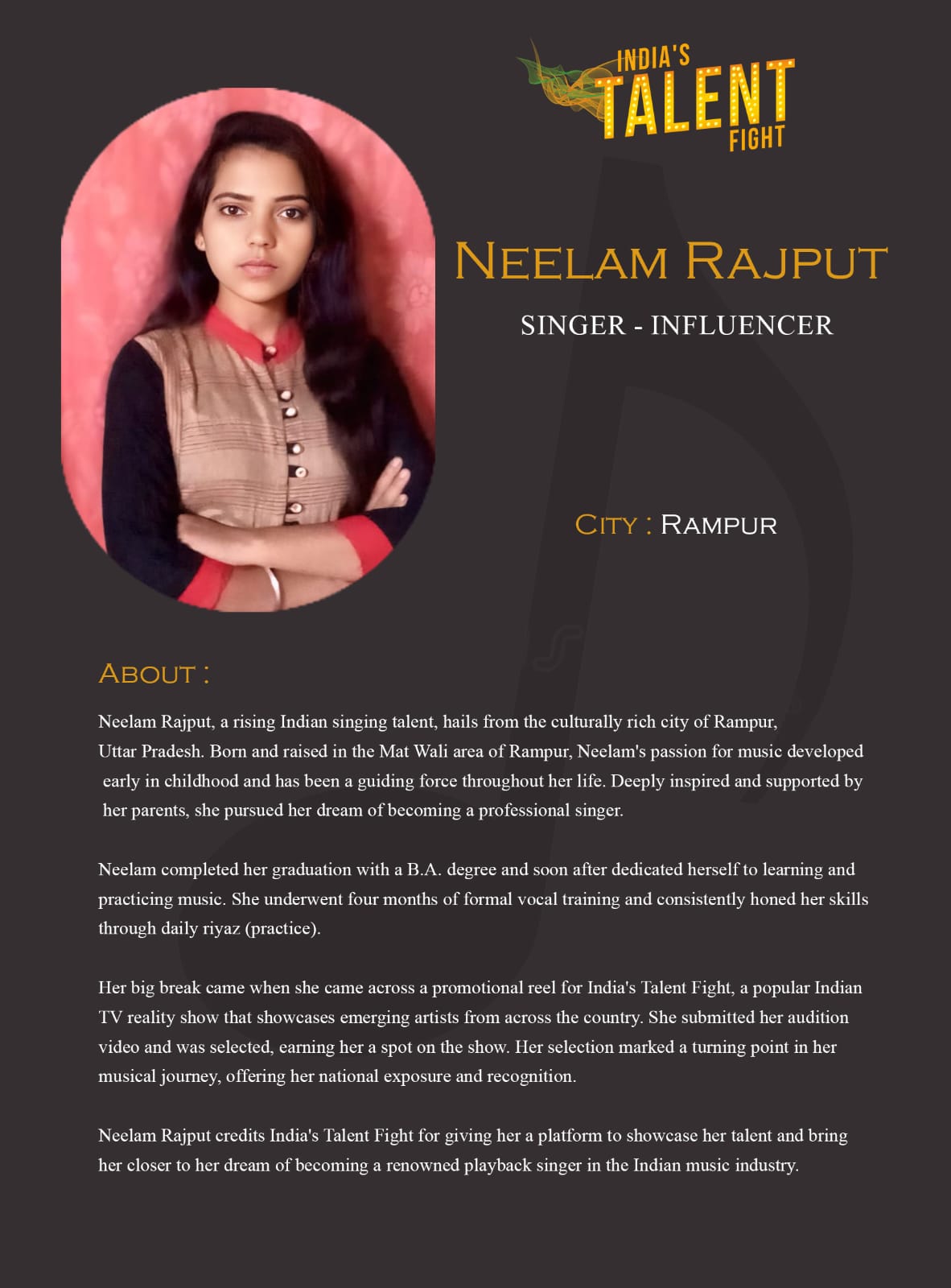 ITF Singer Neelam Rajput RampurNeelam Rajput (Singer)Indian Reality TV Star | Singer | Contestant on India’s Talent FightBiographyNeelam Rajput, a rising Indian singing talent, hails from the culturally rich city of Rampur, Uttar Pradesh. Born and raised in the Mat Wali area of Rampur, Neelam’s passion for music developed early in childhood and has been a guiding force throughout her life. Deeply inspired and supported by her parents, she pursued her dream of becoming a