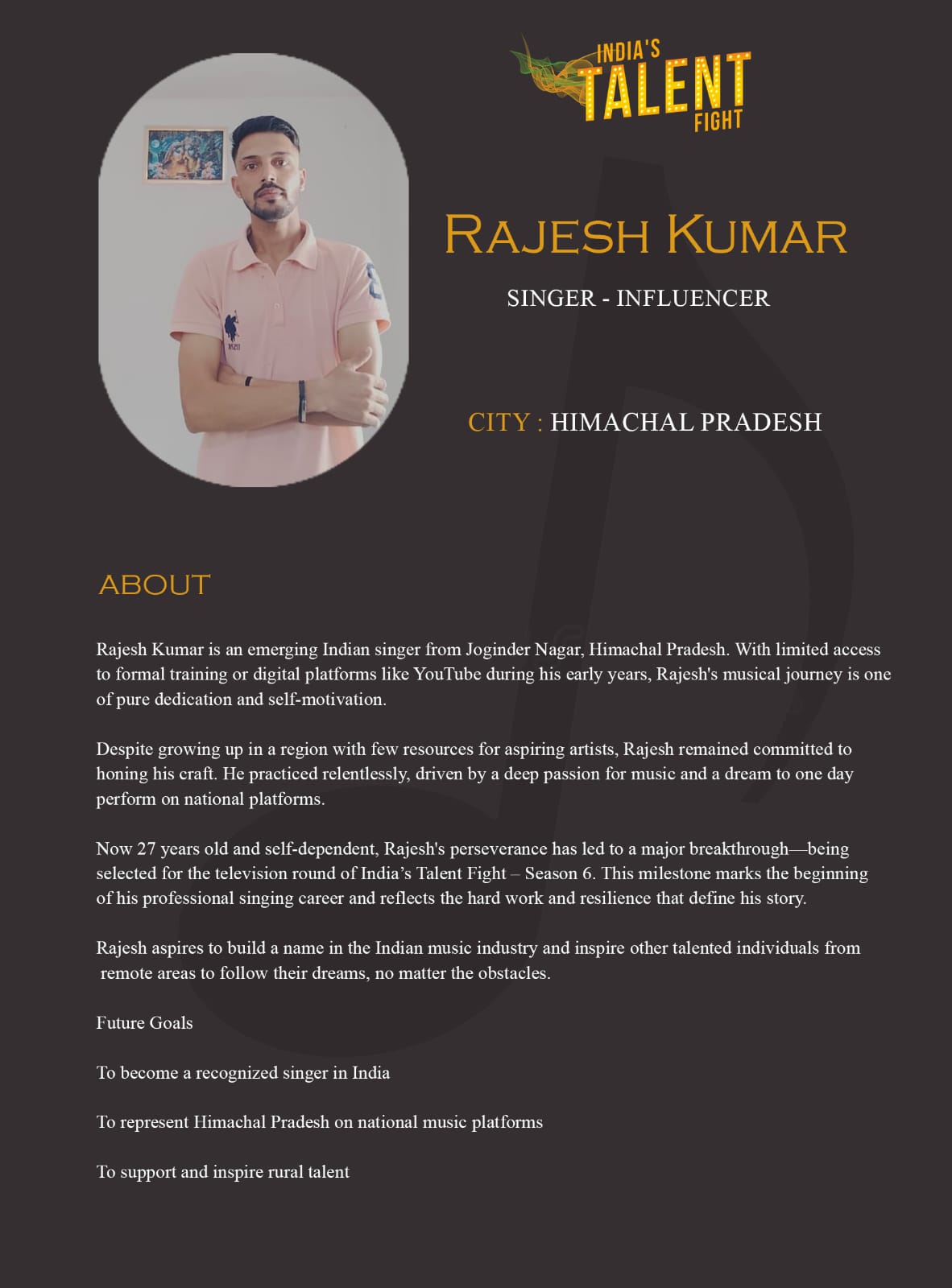 ITF Singer Rajesh Kumar Himachal PradeshSinger | Performer | Aspiring ArtistOrigin: Joginder Nagar, Himachal Pradesh, IndiaOccupation: SingerYears Active: 2023–presentKnown For: Contestant on India’s Talent Fight – Season 6BiographyRajesh Kumar is an emerging Indian singer from Joginder Nagar, Himachal Pradesh. With limited access to formal training or digital platforms like YouTube during his early years, Rajesh’s musical journey is one of pure dedication and self-motivation.Despite growing up in a region with few resources for aspiring artists,