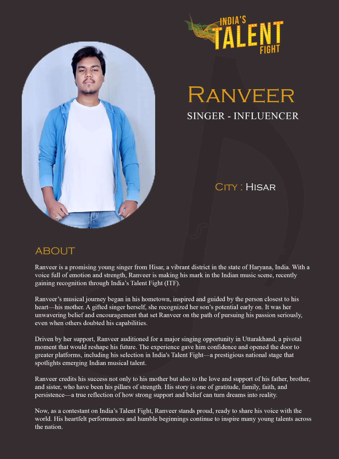 ITF Singer Ranveer HisarRanveer is a promising young singer from Hisar, a vibrant district in the state of Haryana, India. With a voice full of emotion and strength, Ranveer is making his mark in the Indian music scene, recently gaining recognition through India’s Talent Fight (ITF).Ranveer’s musical journey began in his hometown, inspired and guided by the person closest to his heart—his mother. A gifted singer herself, she recognized her son’s potential early on. It