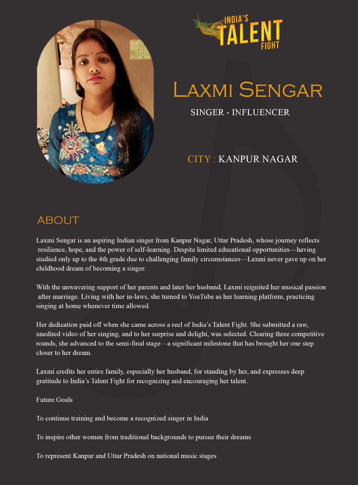 ITF Singer Laxmi Sengar Kanpur NagarAspiring Singer | Homemaker | PerformerOrigin: Kanpur Nagar, Uttar Pradesh, IndiaOccupation: Singer (Independent), HomemakerYears Active: 2024–presentKnown For: Contestant on India’s Talent Fight – Semi-FinalistBiographyLaxmi Sengar is an aspiring Indian singer from Kanpur Nagar, Uttar Pradesh, whose journey reflects resilience, hope, and the power of self-learning. Despite limited educational opportunities—having studied only up to the 4th grade due to challenging family circumstances—Laxmi never gave up on her childhood dream of becoming