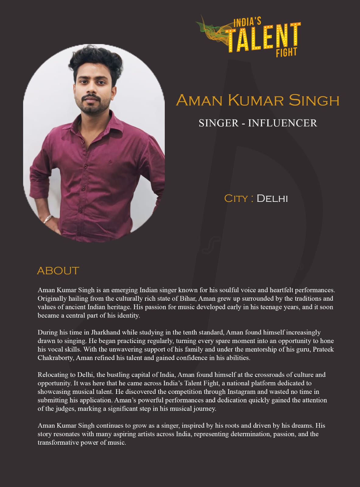 ITF Singer Aman Kumar Singh DelhiAman Kumar Singh is an emerging Indian singer known for his soulful voice and heartfelt performances. Originally hailing from the culturally rich state of Bihar, Aman grew up surrounded by the traditions and values of ancient Indian heritage. His passion for music developed early in his teenage years, and it soon became a central part of his identity.During his time in Jharkhand while studying in the tenth standard, Aman found
