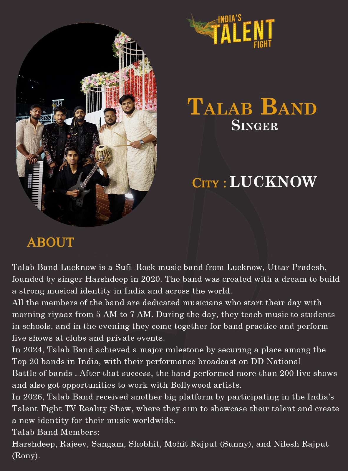 ITF Singer Talab Band lucknowTalab Band Lucknow is a Sufi–Rock music band from Lucknow, Uttar Pradesh, founded by singer Harshdeep in 2020. The band was created with a dream to build a strong musical identity in India and across the world.All the members of the band are dedicated musicians who start their day with morning riyaaz from 5 AM to 7 AM. During the day, they teach music to students in schools, and in the