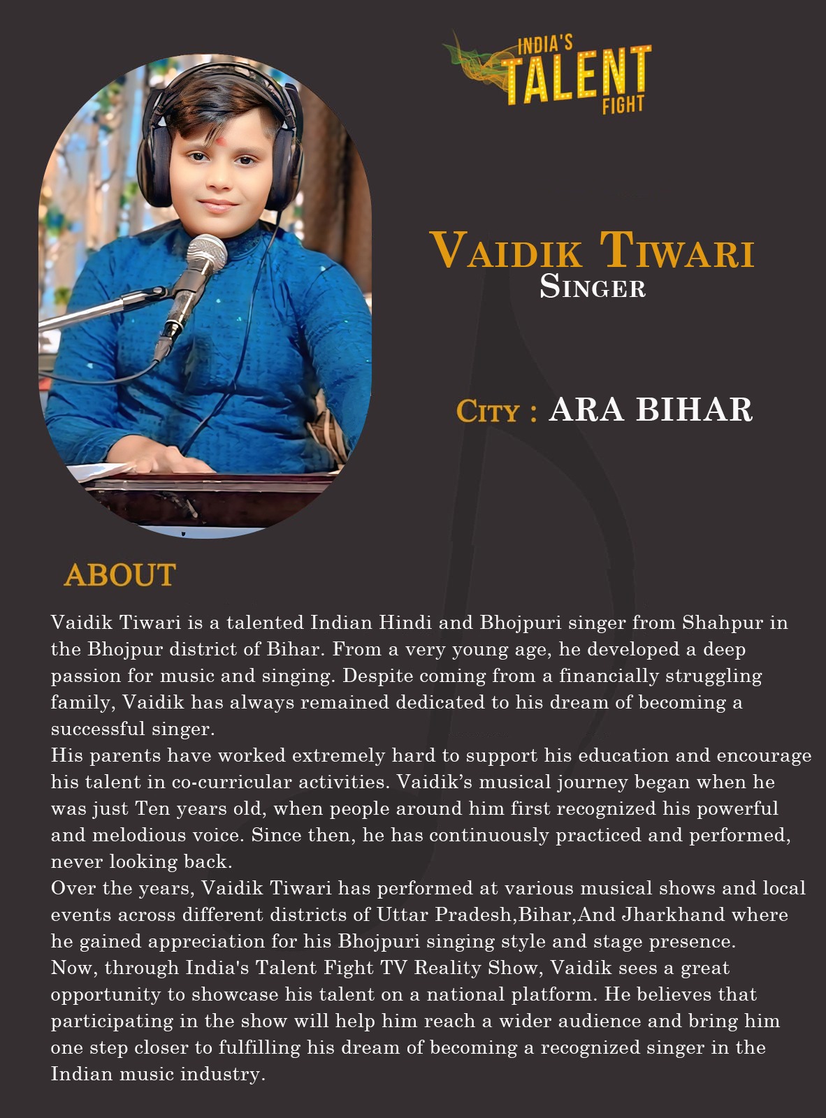ITF Singer vaidik Tiwari Ara BiharVaidik Tiwari is a talented Indian Hindi and Bhojpuri singer from Shahpur in the Bhojpur district of Bihar. From a very young age, he developed a deep passion for music and singing. Despite coming from a financially struggling family, Vaidik has always remained dedicated to his dream of becoming a successful singer.His parents have worked extremely hard to support his education and encourage his talent in co-curricular activities. Vaidik’s musical