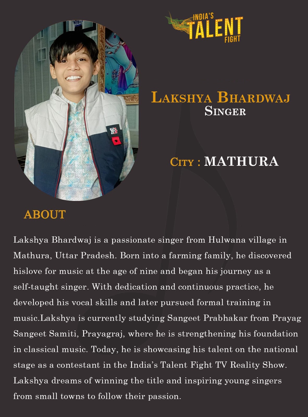 ITF Singer Lakshya Bhardwaj MathuraLakshya Bhardwaj is a passionate singer from Hulwana village in Mathura, Uttar Pradesh. Born into a farming family, he discovered his love for music at the age of nine and began his journey as a self-taught singer. With dedication and continuous practice, he developed his vocal skills and later pursued formal training in music.Lakshya is currently studying Sangeet Prabhakar from Prayag Sangeet Samiti, Prayagraj, where he is strengthening his foundation in