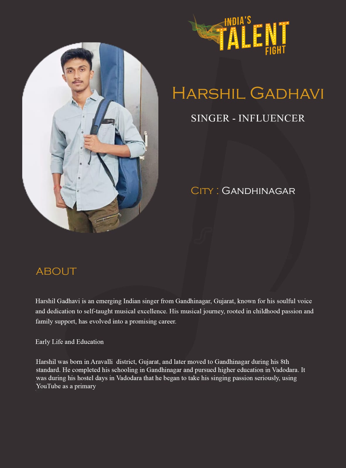 ITF Singer Harshil Gadhavi GandhinagarHarshil Gadhavi is an emerging Indian singer from Gandhinagar, Gujarat, known for his soulful voice and dedication to self-taught musical excellence. His musical journey, rooted in childhood passion and family support, has evolved into a promising career.Early Life and EducationHarshil was born in Aravalli district, Gujarat, and later moved to Gandhinagar during his 8th standard. He completed his schooling in Gandhinagar and pursued higher education in Vadodara. It was during his