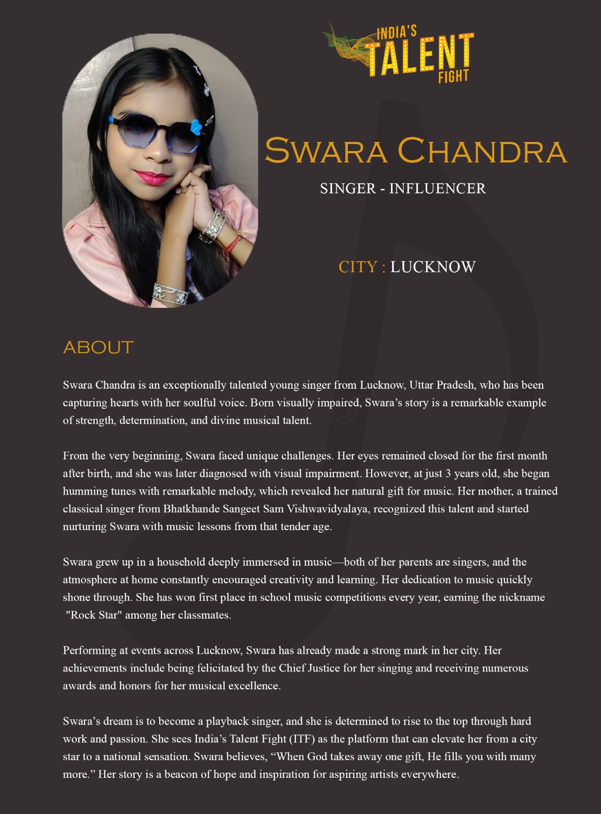 ITF Singer Swara Chandra LucknowSwara Chandra is an exceptionally talented young singer from Lucknow, Uttar Pradesh, who has been capturing hearts with her soulful voice. Born visually impaired, Swara’s story is a remarkable example of strength, determination, and divine musical talent.From the very beginning, Swara faced unique challenges. Her eyes remained closed for the first month after birth, and she was later diagnosed with visual impairment. However, at just 3 years old, she began humming