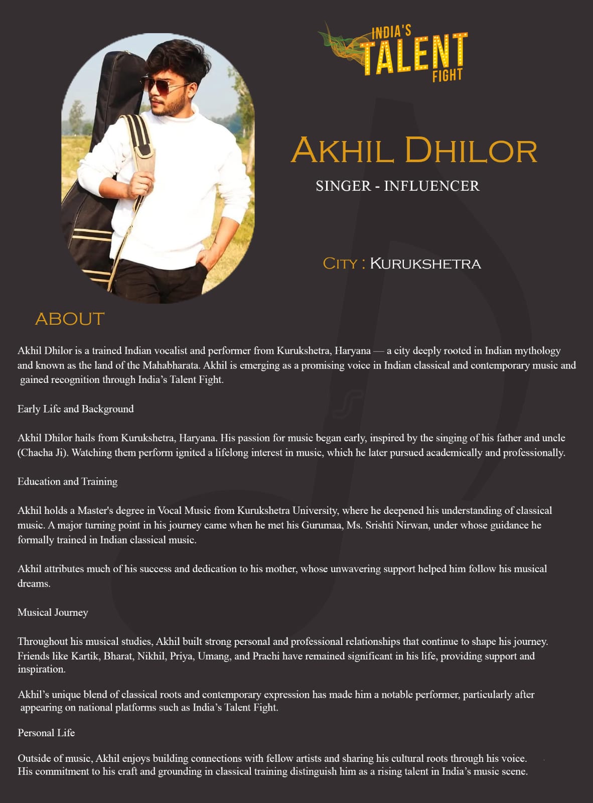 ITF Singer Akhil Dhilor KurukshetraAkhil Dhilor is a trained Indian vocalist and performer from Kurukshetra, Haryana — a city deeply rooted in Indian mythology and known as the land of the Mahabharata. Akhil is emerging as a promising voice in Indian classical and contemporary music and gained recognition through India’s Talent Fight.Early Life and BackgroundAkhil Dhilor hails from Kurukshetra, Haryana. His passion for music began early, inspired by the singing of his father and uncle