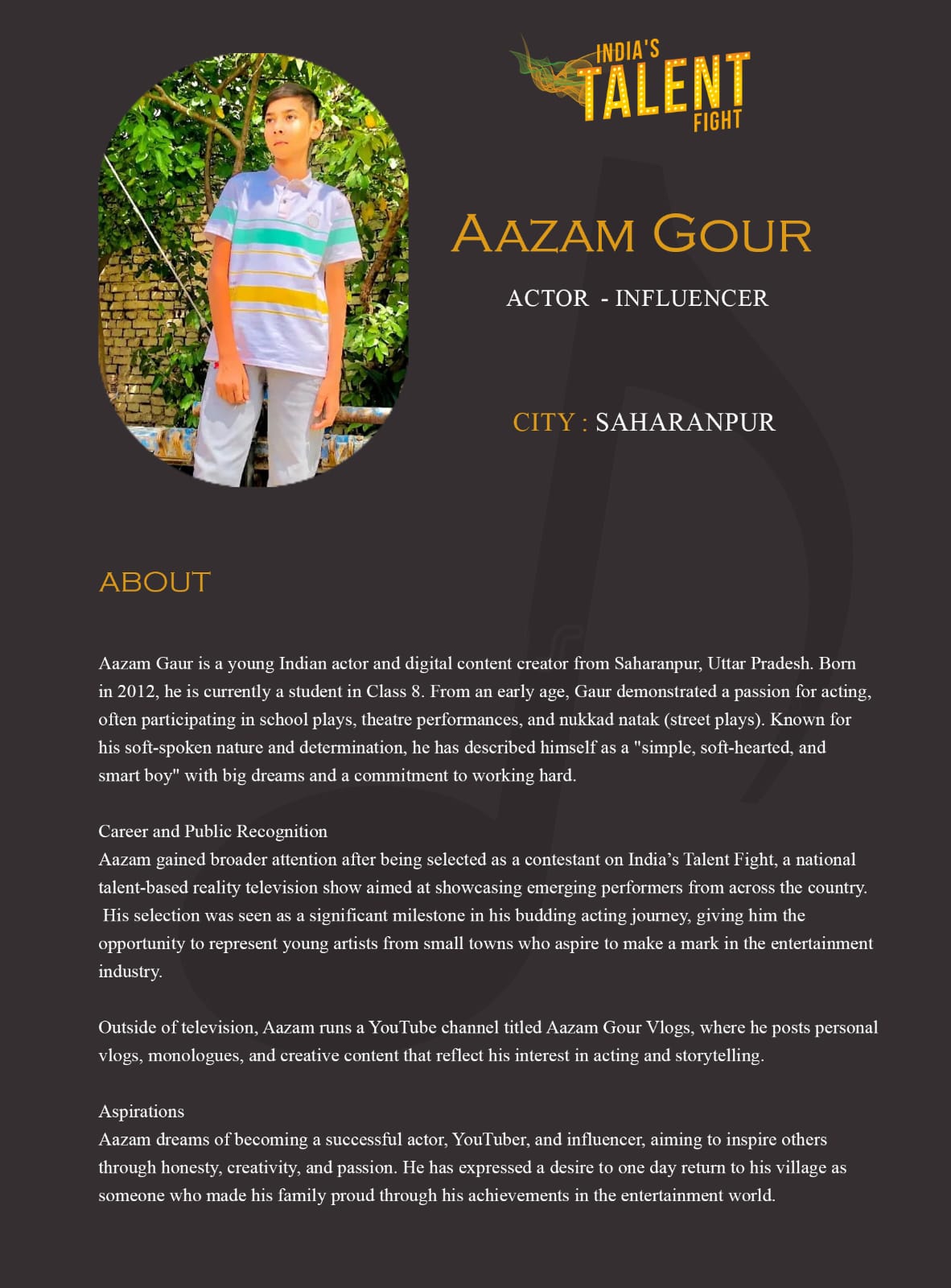 ITF Actor Aazam Gour SaharanpurBorn: Saharanpur, Uttar Pradesh, IndiaOccupation: Student, Actor, YouTuberYears active: 2022–presentKnown for: Contestant on India’s Talent Fight, YouTube Channel “Aazam Gour Vlogs”Early Life and BackgroundAazam Gaur is a young Indian actor and digital content creator from Saharanpur, Uttar Pradesh. Born in 2012,he is currently a student in Class 8. From an early age, Gaur demonstrated a passion for acting, often participating in school plays, theatre performances, and nukkad natak (street plays). Known
