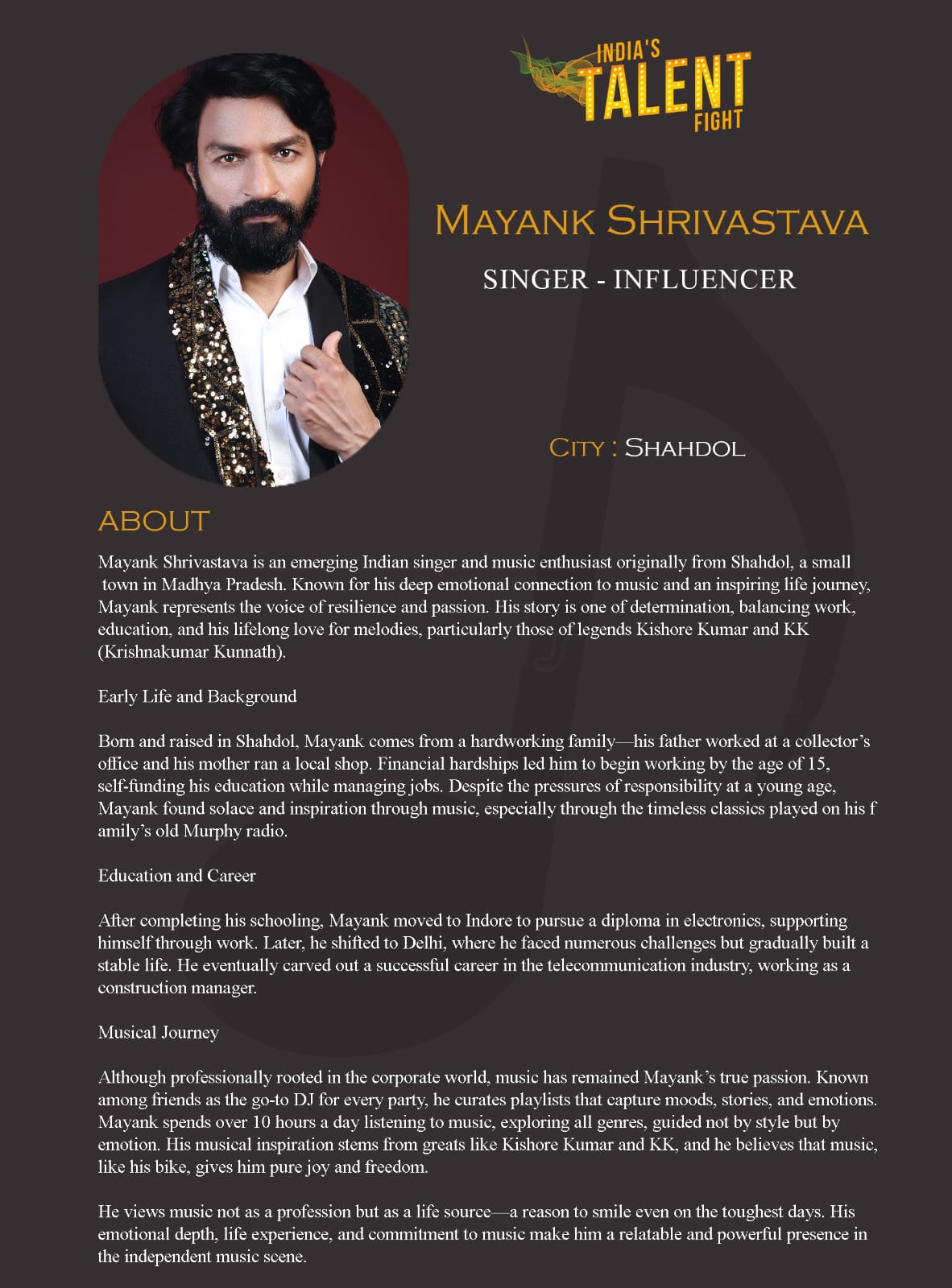 ITF Singer Mayank Shrivastava Shahdol.Mayank Shrivastava is an emerging Indian singer and music enthusiast originally from Shahdol, a small town in Madhya Pradesh. Known for his deep emotional connection to music and an inspiring life journey, Mayank represents the voice of resilience and passion. His story is one of determination, balancing work, education, and his lifelong love for melodies, particularly those of legends Kishore Kumar and KK (Krishnakumar Kunnath).Early Life and BackgroundBorn and raised in