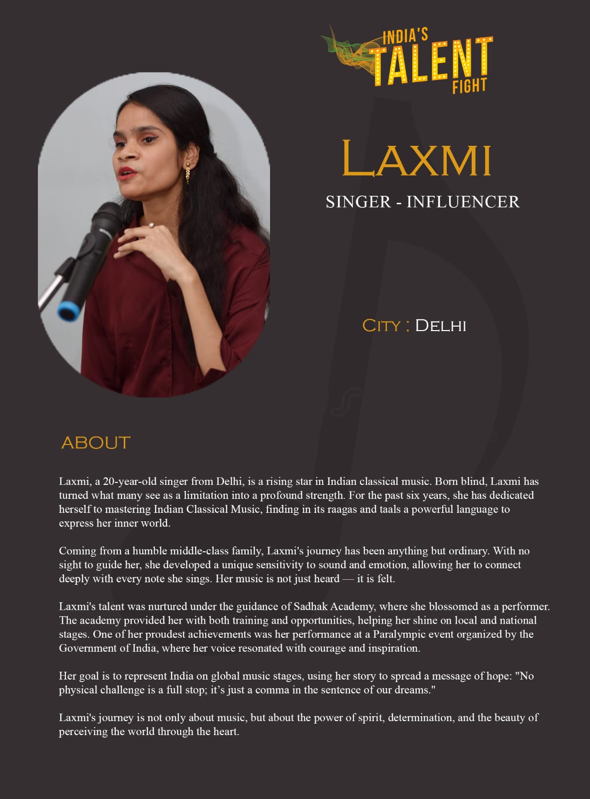 ITF Singer Laxmi Delhi.Laxmi, a 20-year-old singer from Delhi, is a rising star in Indian classical music. Born blind, Laxmi has turned what many see as a limitation into a profound strength. For the past six years, she has dedicated herself to mastering Indian Classical Music, finding in its raagas and taals a powerful language to express her inner world.Coming from a humble middle-class family, Laxmi’s journey has been anything but ordinary. With no sight