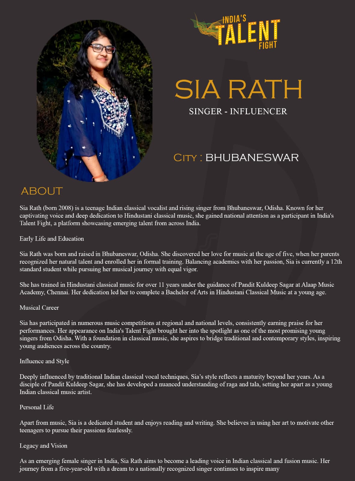 ITF SINGER SIA RATH BHUBANESWAR.Sia Rath (born 2008) is a teenage Indian classical vocalist and rising singer from Bhubaneswar, Odisha. Known for her captivating voice and deep dedication to Hindustani classical music, she gained national attention as a participant in India’s Talent Fight, a platform showcasing emerging talent from across India.Early Life and EducationSia Rath was born and raised in Bhubaneswar, Odisha. She discovered her love for music at the age of five, when her