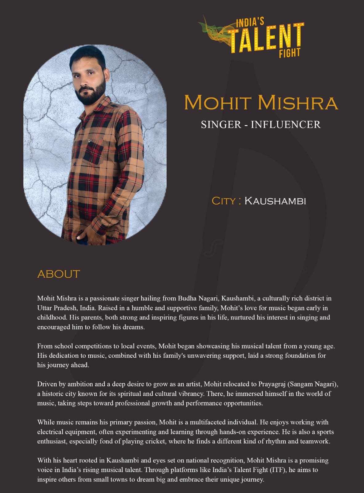 ITF Singer Mohit Mishra KaushambiMohit Mishra is a passionate singer hailing from Budha Nagari, Kaushambi, a culturally rich district in Uttar Pradesh, India. Raised in a humble and supportive family, Mohit’s love for music began early in childhood. His parents, both strong and inspiring figures in his life, nurtured his interest in singing and encouraged him to follow his dreams.From school competitions to local events, Mohit began showcasing his musical talent from a young age.
