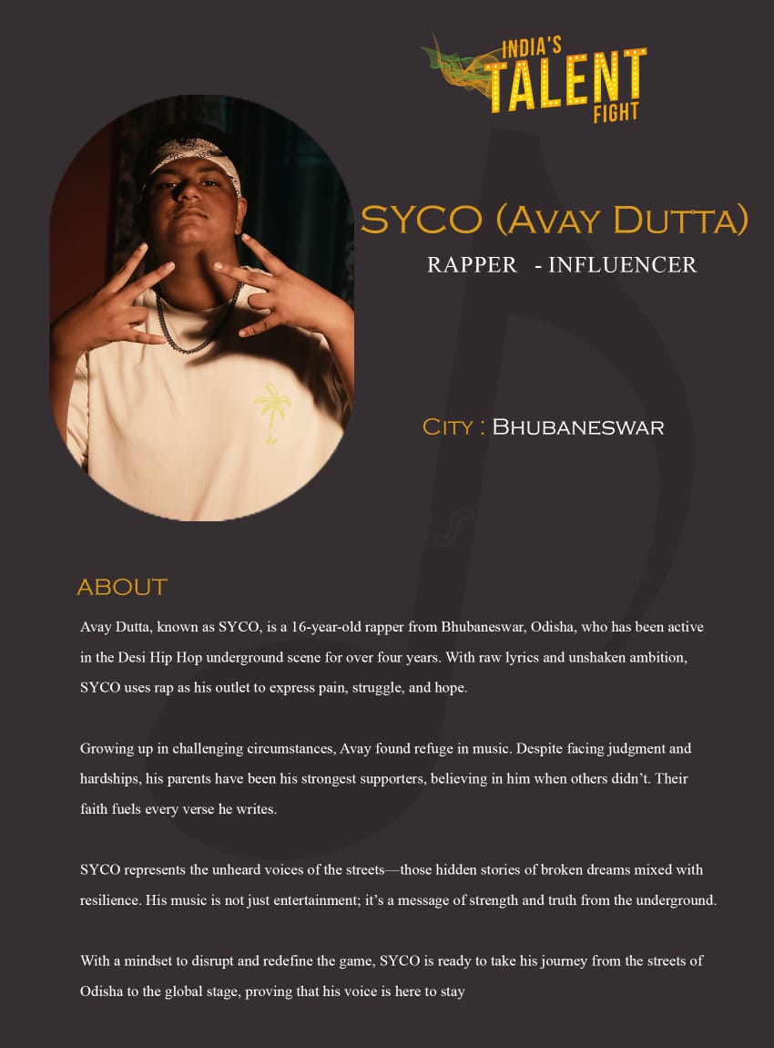 ITF RAPPER SYCO (Avay Dutta) BhubaneswarAvay Dutta, known as SYCO, is a 16-year-old rapper from Bhubaneswar, Odisha, who has been active in the Desi Hip Hop underground scene for over four years. With raw lyrics and unshaken ambition, SYCO uses rap as his outlet to express pain, struggle, and hope.Growing up in challenging circumstances, Avay found refuge in music. Despite facing judgment and hardships, his parents have been his strongest supporters, believing in him when