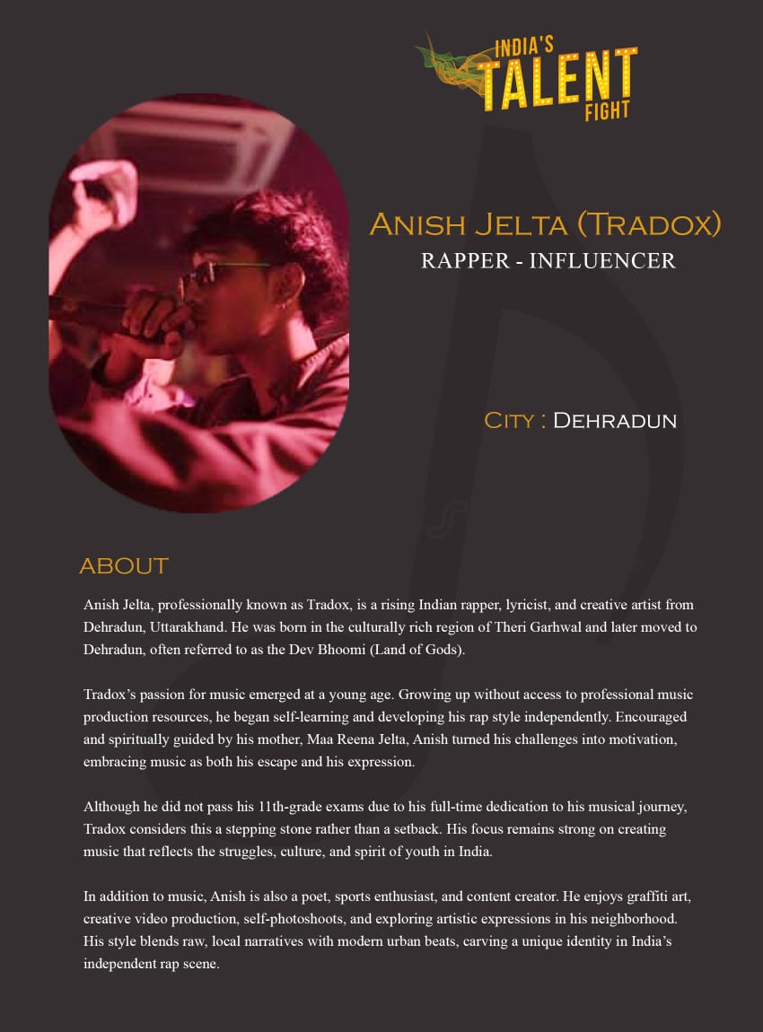 ITF Rapper Anish Jelta (Tradox) DehradunAnish Jelta, professionally known as Tradox, is a rising Indian rapper, lyricist, and creative artist from Dehradun, Uttarakhand. He was born in the culturally rich region of Theri Garhwal and later moved to Dehradun, often referred to as the Dev Bhoomi (Land of Gods).Tradox’s passion for music emerged at a young age. Growing up without access to professional music production resources, he began self-learning and developing his rap style independently.